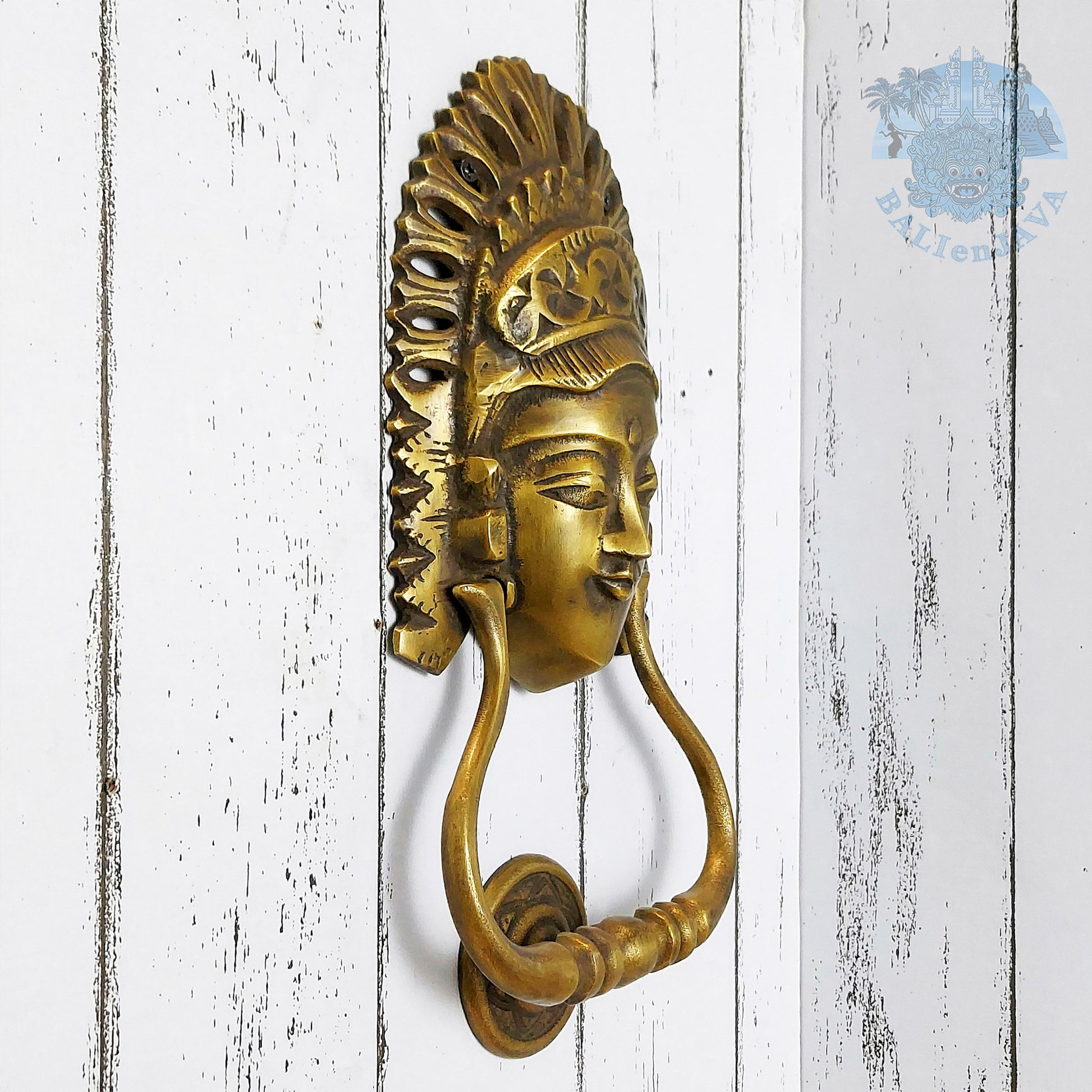 This solid brass door knocker features a Balinese woman wearing a traditional ceremonial headdress called gelungan. Combining function with traditional aesthetic, it is suitable for both traditional and contemporary front doors, offering a subtle cultural element without overpowering the space.