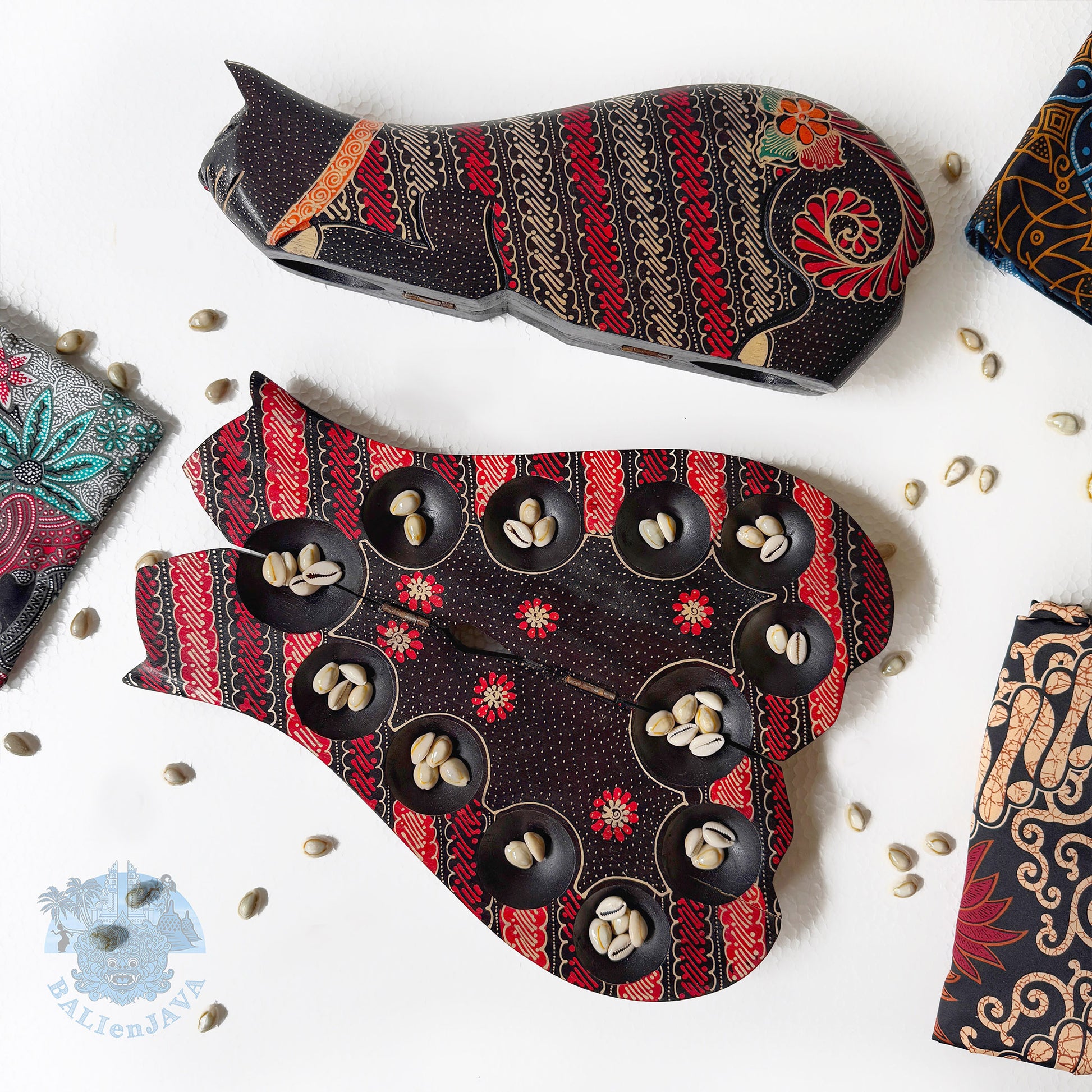 Cat Wooden Mancala Board Game New Design – Handmade Batik Pattern – Classic Strategy Game for Family Fun & Math Skills – Unique Home Decor & Gift Idea – Congkak, Oware, Kalaha