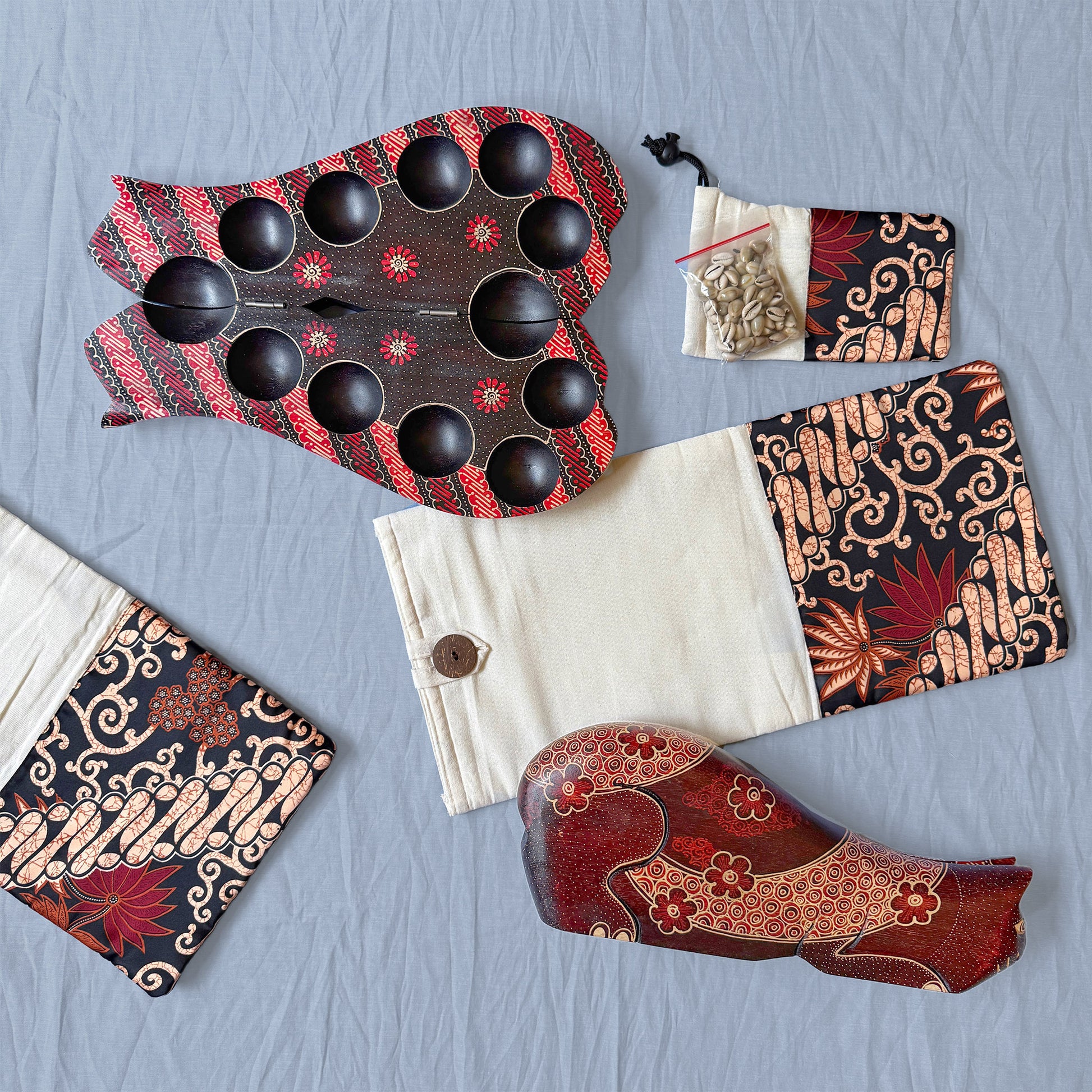 INCLUDES BATIK TRAVEL POUCH & COWRIE/COWRY SEASHELLS AS MANCALA SEEDS