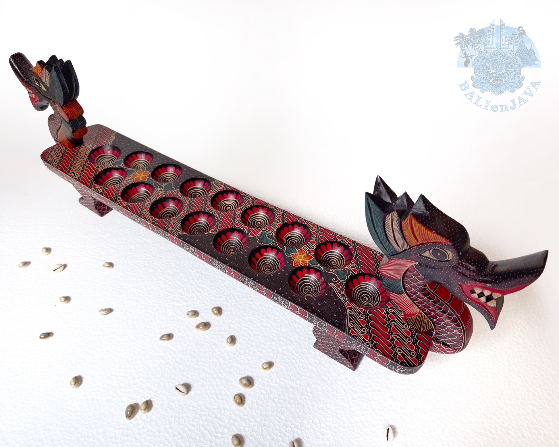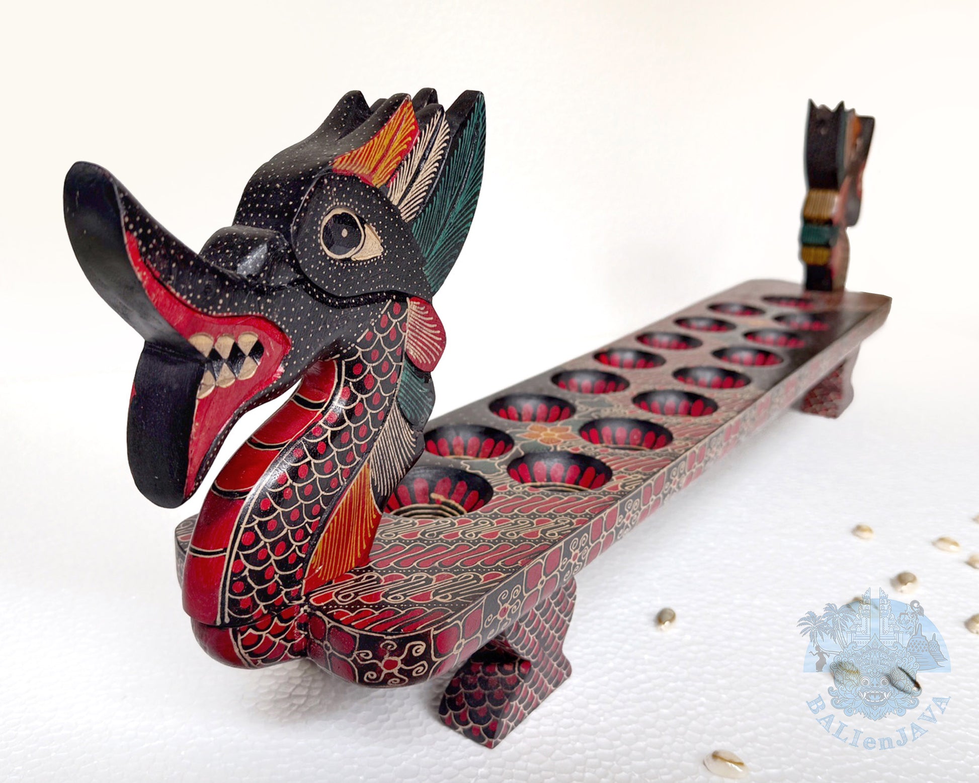 Dragon-shaped wooden mancala board game with detachable parts and 7-holes pits. This classic two-player game challenges you to think ahead, outmaneuver your opponent, and capture their pieces. This variant has intermediate level of difficulty, suitable for kids age 8 and up. The traditionally hand-painted pattern makes it a unique gift and decor piece when not in play.